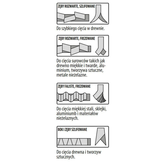 Wykonane z wykorzystaniem zaawansowanych procesów, przy użyciu najlepszych technologicznie maszyn, brzeszczoty te są specjalnie zaprojektowane do cięcia miękkiego i twardego drewna, płyt OSB, płyt laminowanych, tworzyw sztucznych, HDP, sklejki, żelaza, aluminium, włókna szklanego, cementu oraz stali nierdzewnej. Piły wykonane są z trzech rodzajów materiału.
