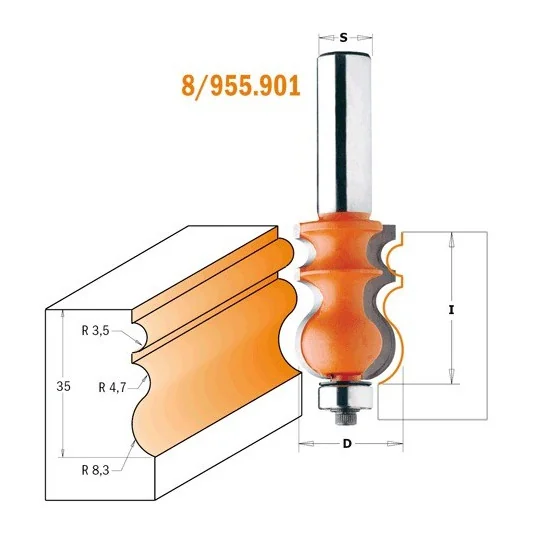 Uzyskanie wybranego kształtu poprzez wielokrotne przejścia wymaga precyzyjnego zaplanowania. Aby uniknąć pomyłek, wykonaj kilka próbnych cięć. Frezy te powinny być używane na stole frezarskim wyposażonym w prowadnice. Dla uzyskania najlepszych wyników pracy, polecane są frezarki 2000W. Frezarki słabsze, mogą być używane pod warunkiem stosowania krótszych I płytszych cięć. Jeśli jest taka możliwość, zmniejsz obroty na frezarce.Serie produktów