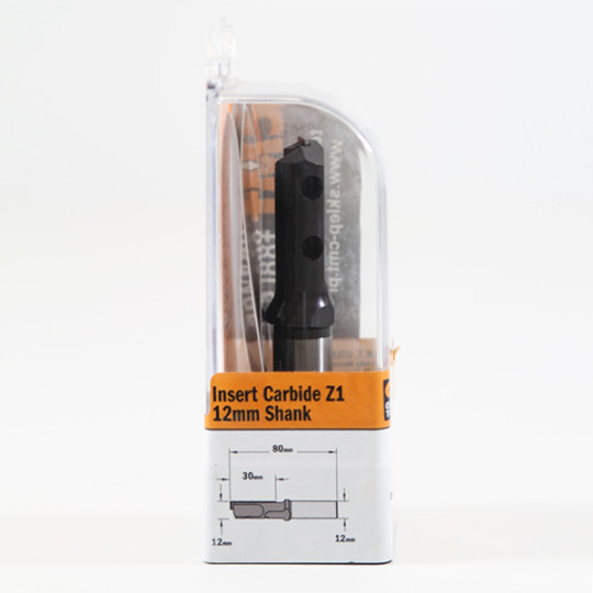 Frez prosty Z=1 na wymienne płytki posiadające wyżłobienia, które zapewniają bezpieczne i stabilne ułożenie ostrza na korpusie. Możliwość frezowania i wiercenia w takich materiałach jak MDF, laminowane DTD oraz twarde drewno. Może być stosowany zarówno we frezarkach ręcznych jak i maszynach CNC.