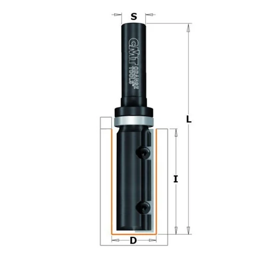 Frez prosty Z=1 na wymienne płytki mocowane za pomocą śrubek typu Torx. Wyposażony dodatkowo w górne łożysko, które umożliwia pracę z wykorzystaniem szablonu. Możliwość frezowania i wiercenia w płycie wiórowej i MDF. Do używania na frezarkach ręcznych.