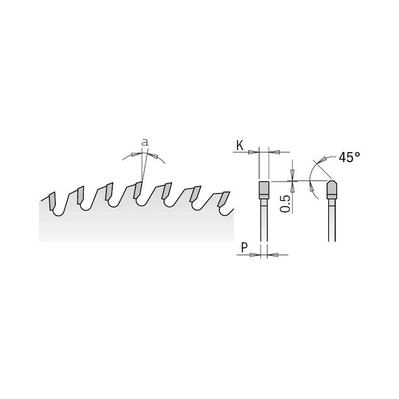 | Kod produktu | Grubość korpusu P | Grubość zęba K | Ilość zębów Z | Kąt natarcia | Kąt przyłożenia | Otwory dodatkowe | Średnica D | Średnica otworu wew. F | Zastosowanie |