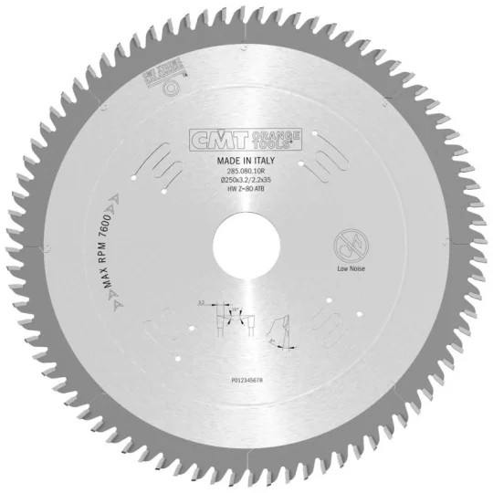 | 285.080.10M | 2,2 mm | 3,2 mm | 80 | 5° | 15° NS (ATB) | COMBI3 | 250 mm | 30 mm | drewno |