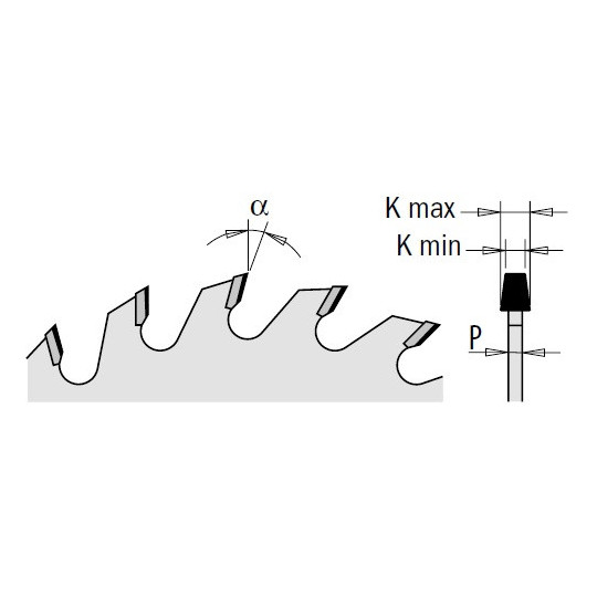 | Kod produktu | Grubość korpusu P | Grubość zęba K | Ilość zębów Z | Kąt natarcia | Kąt przyłożenia | Otwory dodatkowe | Średnica D | Średnica otworu wew. F | Zastosowanie |