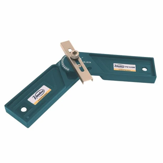 TC133R gwarantuje doskonałe efekty dzięki prostocie użycia: przewodnik automatycznie rozdziela kąt na dwie części, wskazując dokładną pozycję do cięcia (pod kątem podwójnie złożonym, np. 22,5° dla kąta 45°). Wyposażone w blokadę, urządzenie pozwala uniknąć błędów podczas przenoszenia wzoru do ukośnicy lub piły.